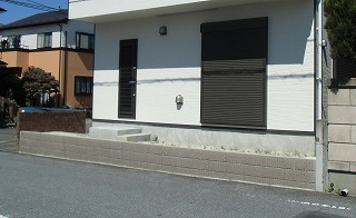 | 更地の状態です。ブロック積み及びフェンスを取り付けます。 | 化粧ブロック三段積みフェンスはシャトレナ1型、カラーはアースブラウンです。 |