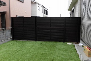| 直ぐ脇の道路から建物が良く見えてしまいます。 | 三協アルミ製の目隠しフェンスハイタイプを取り付けました。 |